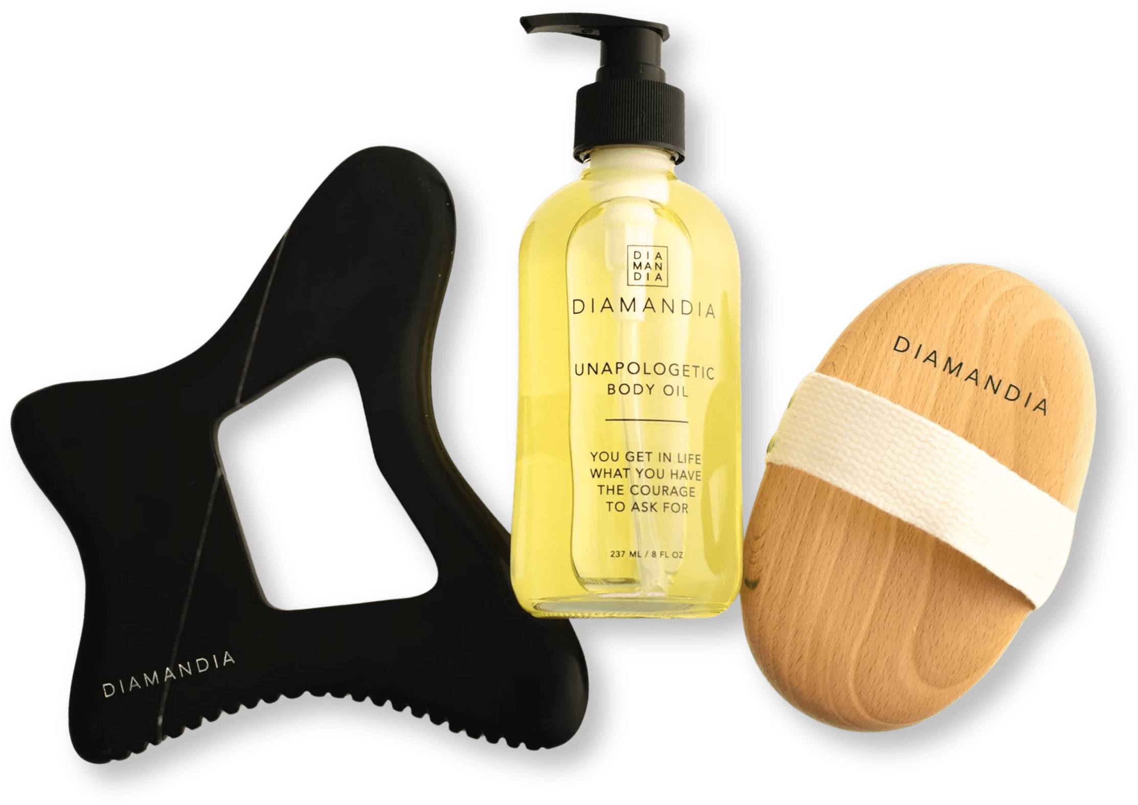 - I dry brush before I shower, then apply Revitalizing Body Oil after my shower. Then I use the DIAMANDIA Body Gua Sha.
